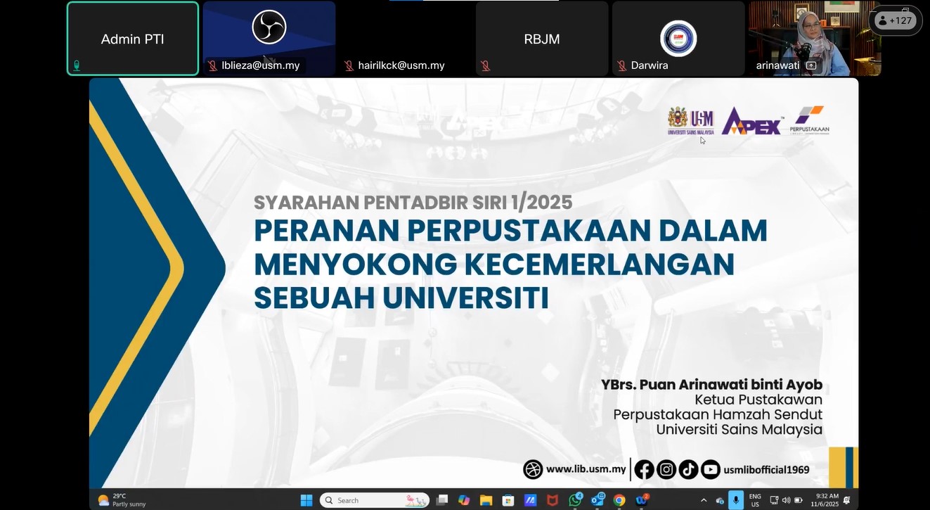11 JUN 25 Syarahan Pentadbir yang bertajuk "Peranan Perpustakaan dalam Menyokong Kecemerlangan Sebuah Universiti" telah berlangsung dengan jayanya dan mendapat sambutan yang menggalakkan daripada kalangan warga Universiti. Syarahan ini mengetengahkan peranan strategik perpustakaan bukan sekadar sebagai pusat sumber maklumat, malah sebagai nadi sokongan kepada ekosistem pembelajaran, penyelidikan dan inovasi universiti.